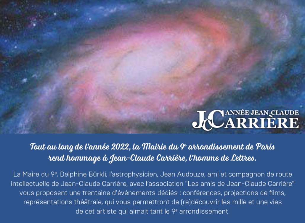 Jean-Claude Carrière, le ciel et la physiqueJeudi 6 octobre à 19h00Mairie du 9e – 6 rue Drouot, 75009 Paris« Moi, de culture littéraire, je ne voulais pas être étranger à la science,cette formidable aventure des temps modernes » Jean – Claude CarrièreCette soirée évoquera son attrait pour les sciences spatiales et la physique.Avec la participationdes astrophysiciens Jean Audouze, Michel Cassé et Élisabeth Vangioni du physicien Thibault Damour, Membre de l’Académie des Sciences de la compositrice Graciane Finzi et de la musicienne (altiste) Karine Lethiec